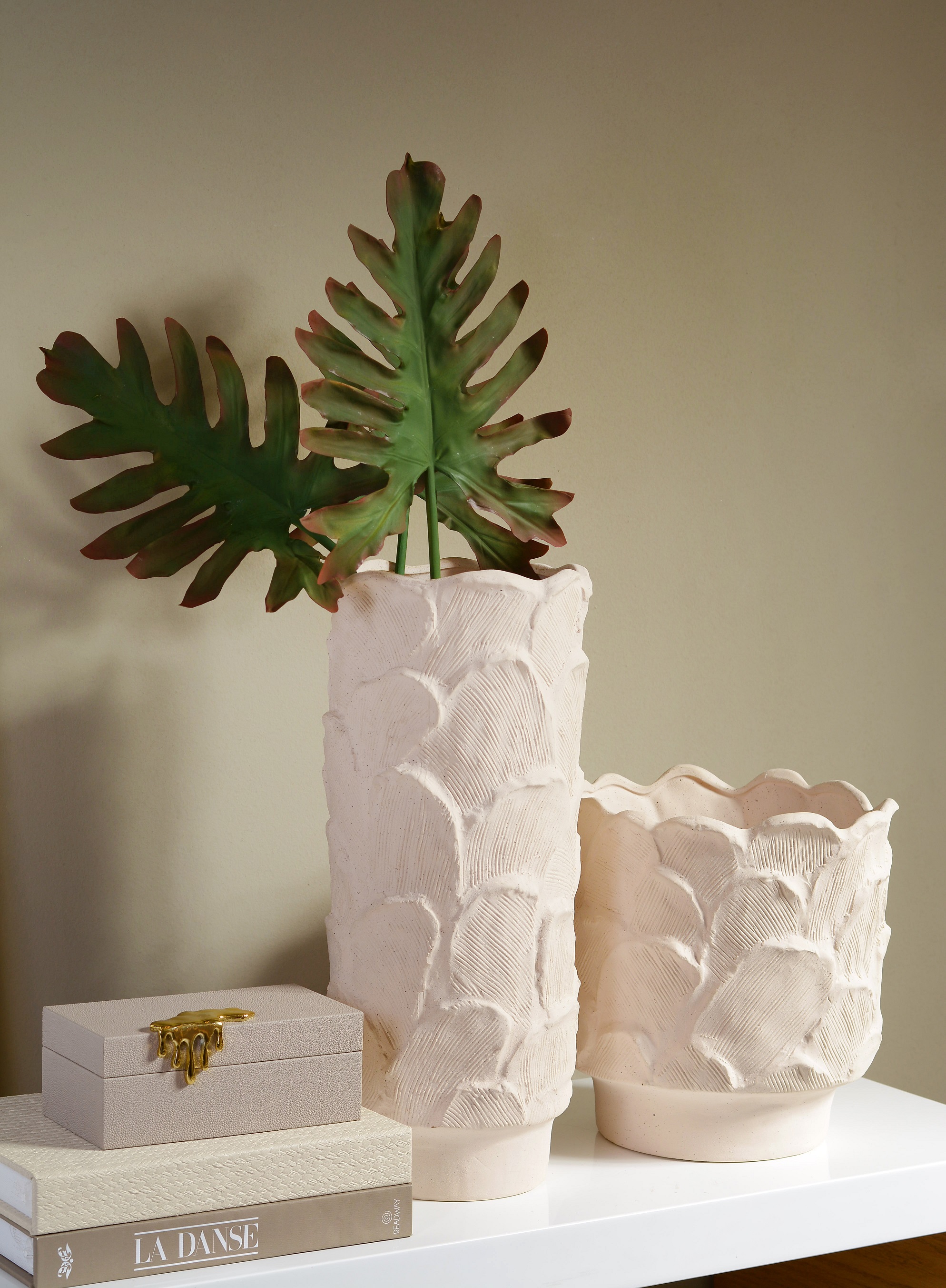 A textura é um dos elementos mais marcantes da Coleção Sintonia. Vasos de cerâmica e porcelana, esculturas de resina com acabamento rústico e abajures de cerâmica são apenas alguns dos itens que trazem um toque artesanal e único para os ambientes.