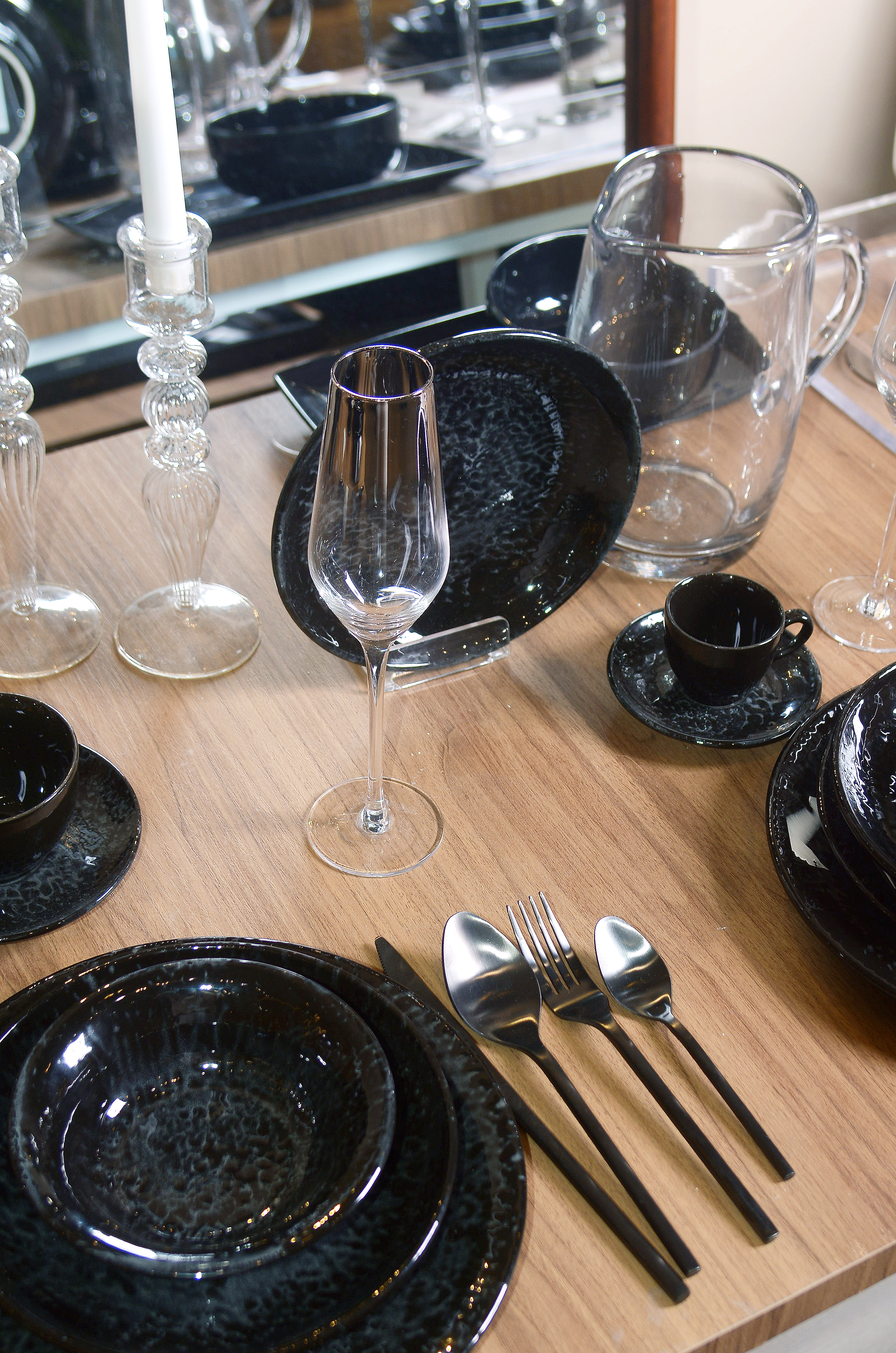 Uma mesa posta com elementos em preto e prata - pratos de porcelana preta, talheres prateados e copos de cristal – faz com que essa composição não só reflita bom gosto, mas também crie uma atmosfera de tranquilidade e luxo discreto. O preto adiciona profundidade e seriedade, enquanto o prata traz um brilho sutil que ilumina o ambiente, criando uma sensação de aconchego e exclusividade.
